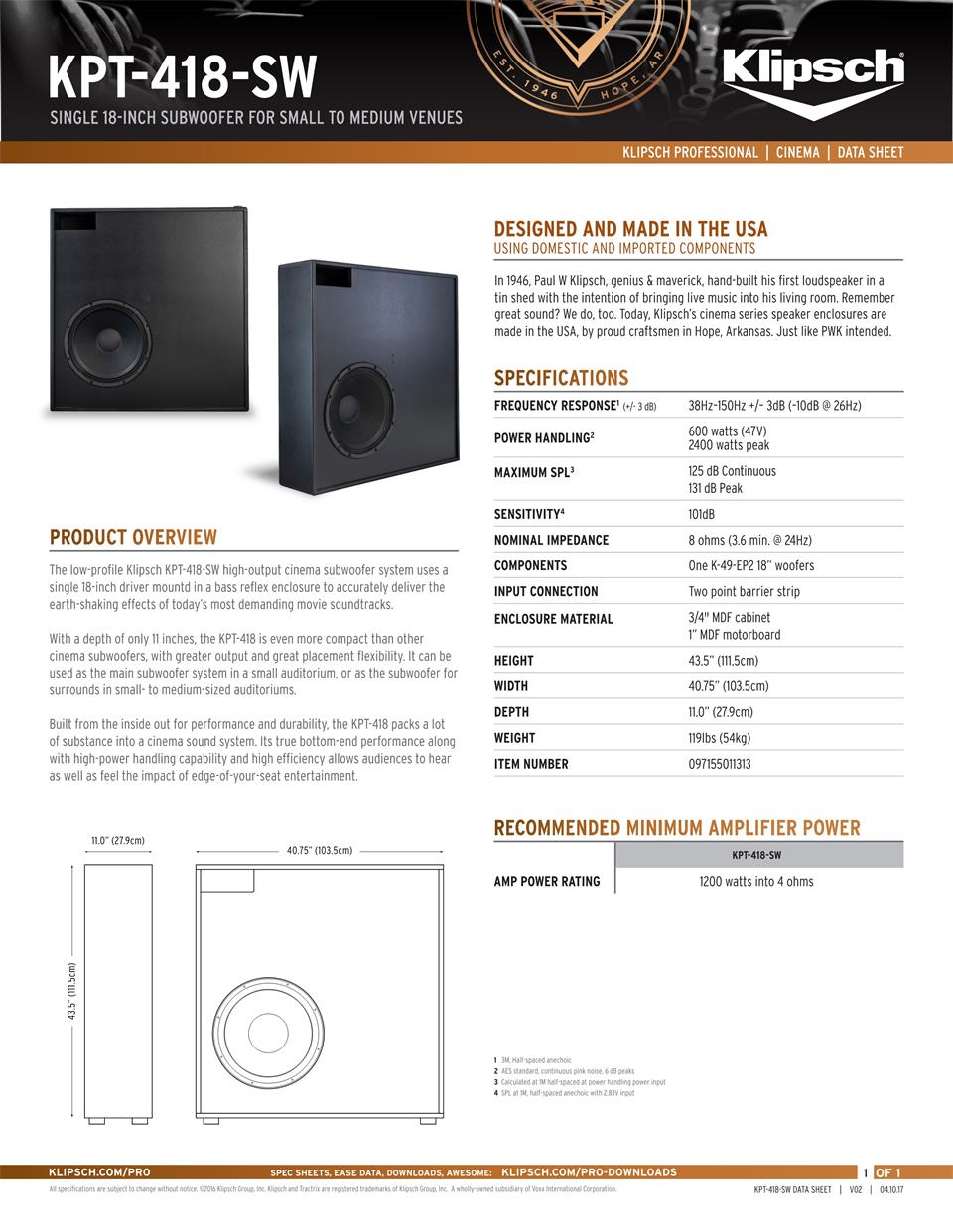 KPT-418-SW是一款高輸出低音反射低音炮系統,具有真正的低端性能以及高功率處理能力和高效率。