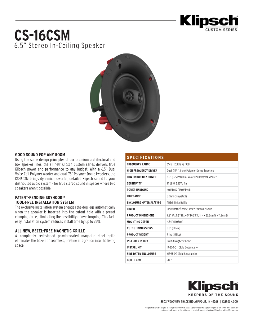 全新的Klipsch Custom系列可為任何預算提供真正的Klipsch聲音.CS-16CSM采用6.5英寸聚酯低音揚聲器和雙0.75英寸聚酯高音揚聲器。通過Swarm技術使用Klipsch專利申請中的SkyHook?免工具安裝系統,安裝時間縮短75%。 特色: 6.5“聚酯低音揚聲器 雙0.75”聚酯高音揚聲器 專利申請中的SkyHook?免工具安裝系統 無邊框磁性柵格
