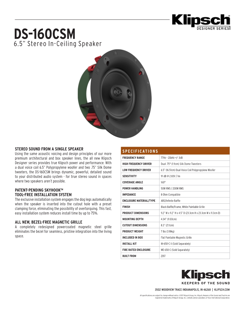 以令人難以置信的價格獲得Klipsch Signature Horn-Loaded性能,DS-160CSM配備6.5英寸聚丙烯低音單元和雙0.75英寸絲膜球頂高音單元,配合圓形Tractrix®號角,實現(xiàn)動態(tài)聲學(xué)性能。使用Klipsch專利申請中的SkyHook?工具免費(fèi)安裝系統(tǒng),您的安裝時間減少了75%。