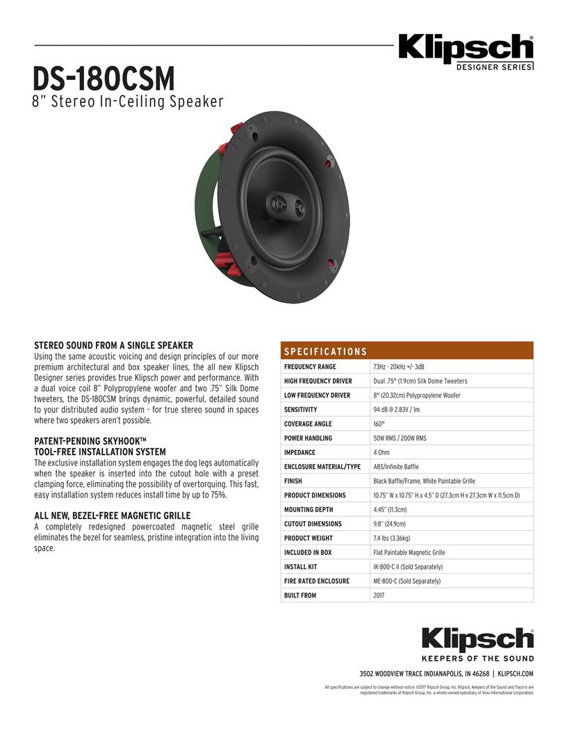 全新的Klipsch Designer系列采用我們更高端的建筑和箱式揚聲器系列的相同聲學發聲和設計原則,提供真正的Klipsch功率和性能。雙音圈8英寸聚丙烯低音單元和兩個0.75英寸絲膜球頂高音單元,DS-180CSM為您的分布式音頻系統帶來動態,強大,細致的聲音 - 在無法使用兩個揚聲器的空間內獲得真正的立體聲效果。 特征: 8“聚丙烯低音揚聲器 雙0.75英寸絲球膜頂高音單元 專利申請中的天棚免?工具安裝系統- 無邊框磁性格柵