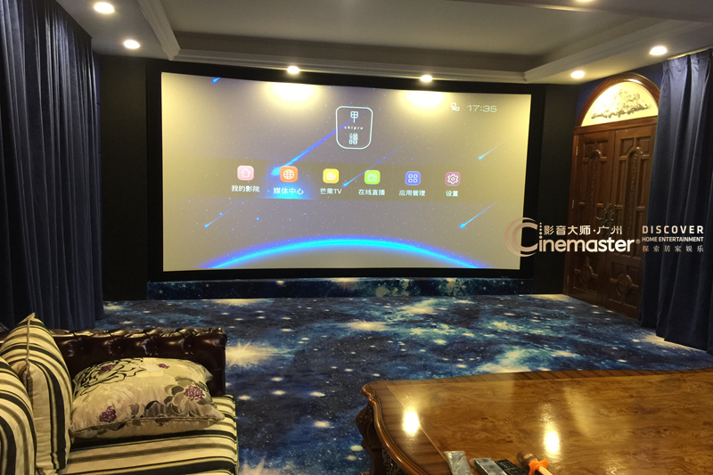 投影畫面開燈實拍圖,幕布使用200寸弧形畫框透聲幕