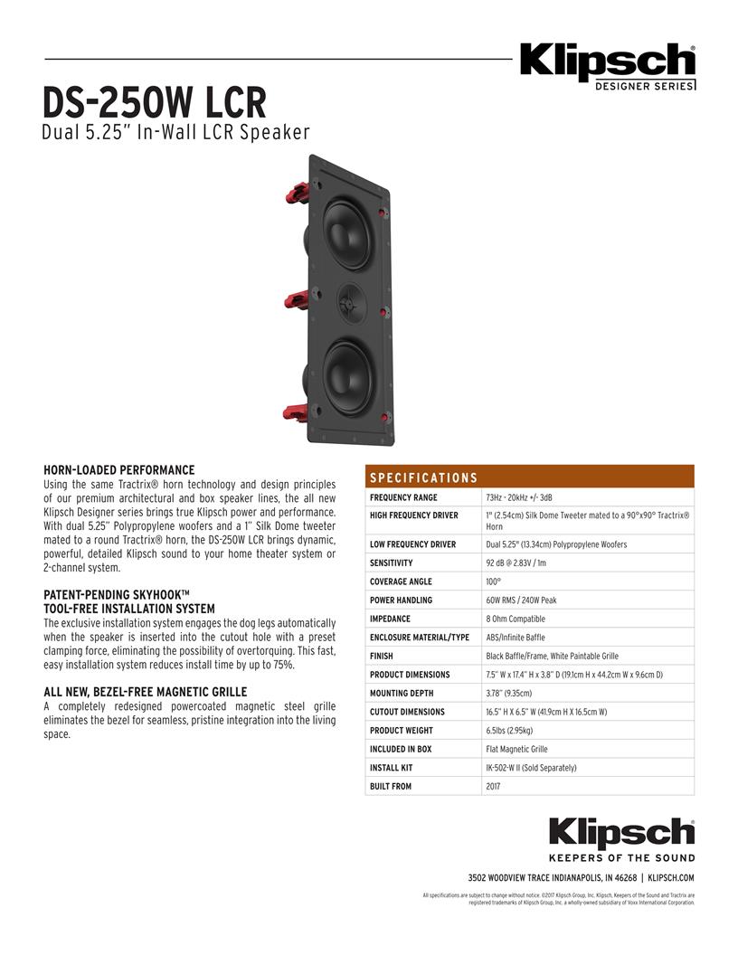 以令人難以置信的價格獲得Klipsch Signature Horn-Loaded性能,DS-250W LCR采用雙5.25英寸聚丙烯低音單元和1“絲膜球頂高音單元,配合圓形Tractrix®號角,實現動態聲學性能。使用Klipsch專利申請中的天棚?免工具安裝系統,您的安裝時間減少了75%。