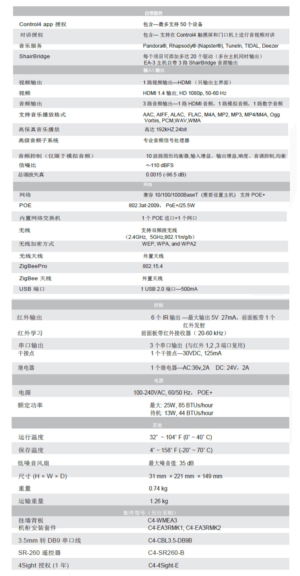 Control4 EA-3娛樂和自動化控制器是多房間、高分辨率音頻和智能家居自動化的完美融合,適合中小型家庭使用。