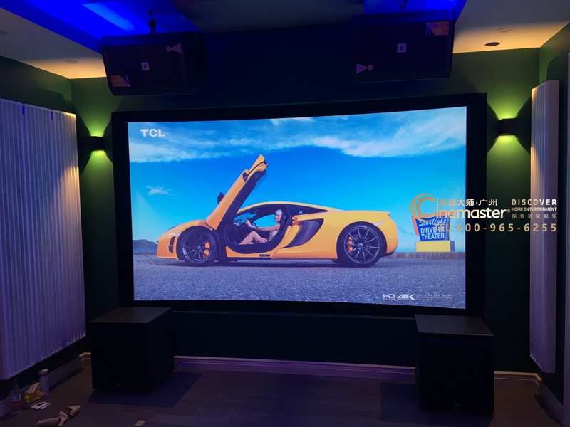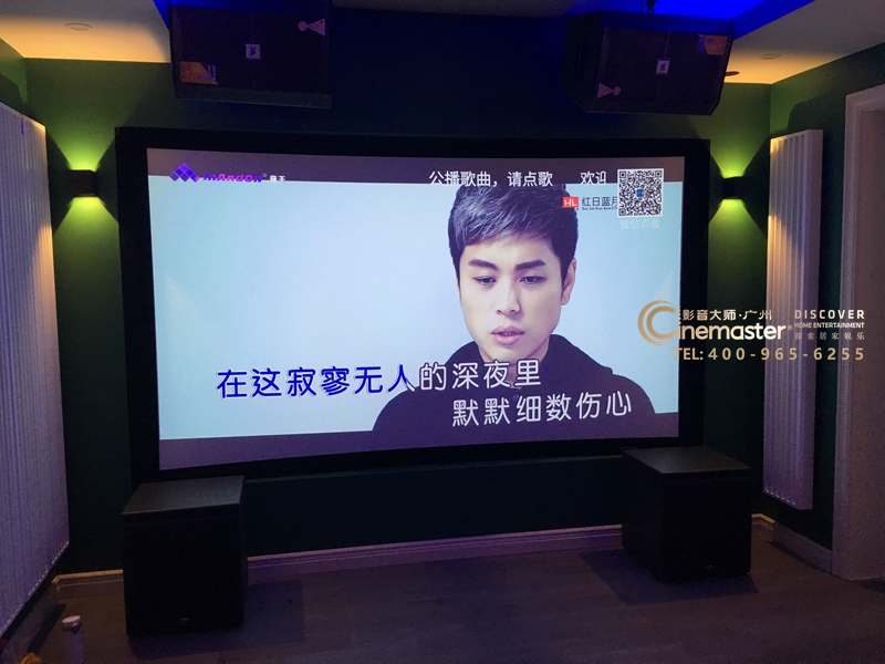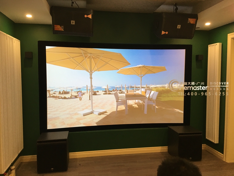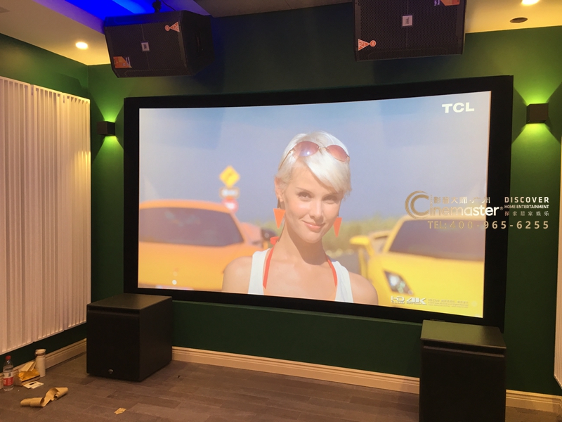 除去放置低音炮及卡拉OK音箱的高度,投影幕最終定制為120寸弧形畫(huà)框透聲;影院音箱則隱藏在投影幕后方