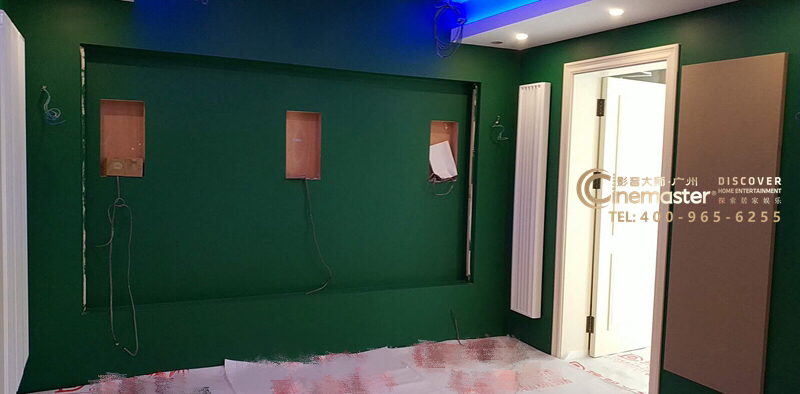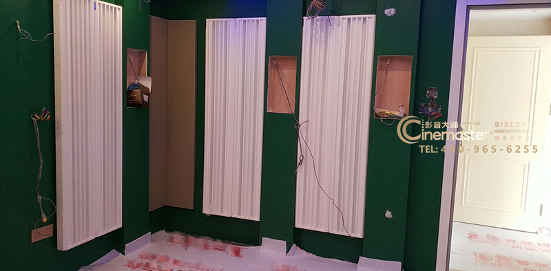 影院左右主音箱及中置音箱嵌入到墻體,隱藏于投影幕后方,圖為影院音箱開(kāi)孔