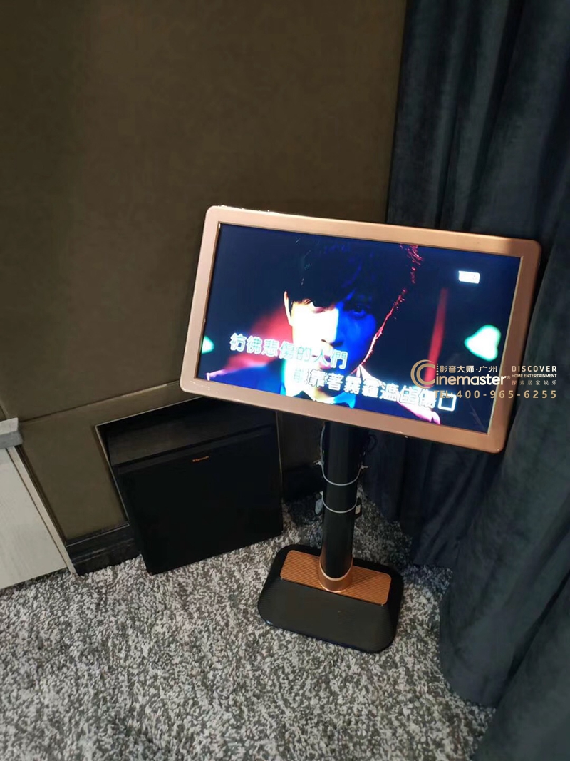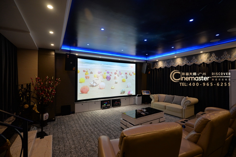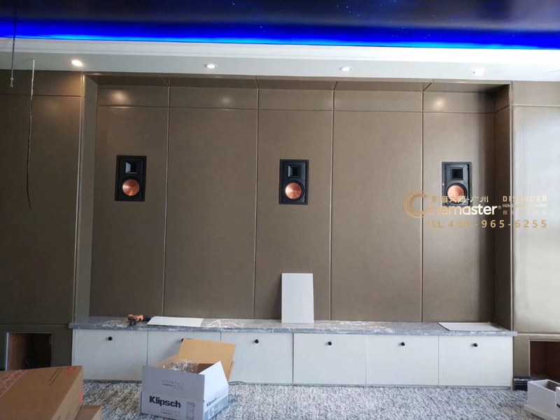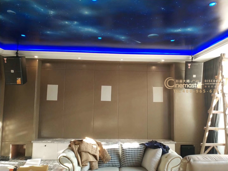 用戶影音房左側為書房,右側是落地窗戶,房間的用途主要是觀影,K歌,聽音樂等。用戶要求書房也要有采光,所以我們的設計師并未把房間獨立隔離出來,而是在影音房與書房間使用雙層厚窗簾;觀影時候則拉上厚窗簾,既可以隔音也可以做吸音材料使用;影音房在負四層,但由于御湖名邸別墅地形特殊,負四層也不是完全在地面以下,所以這次的影音房我們用到了地毯,在聲學方面就容易處理很多,下面分享安裝完工實拍圖。