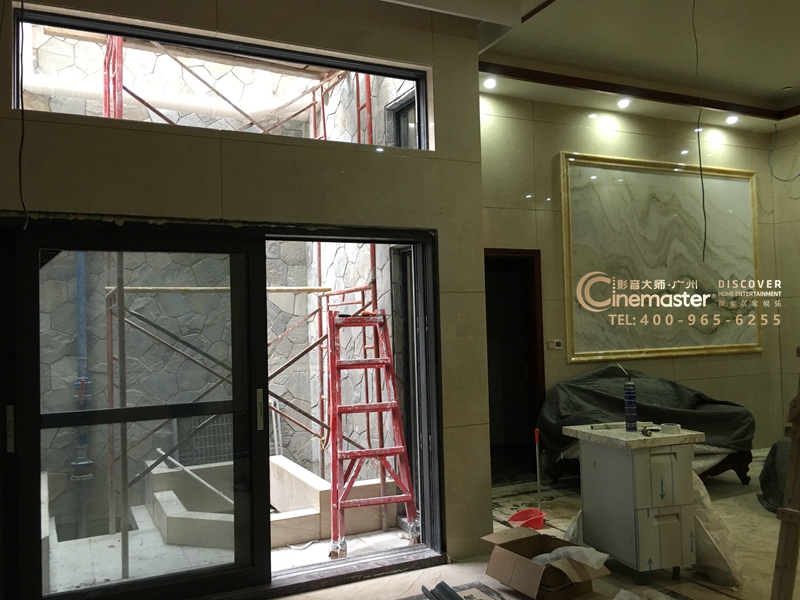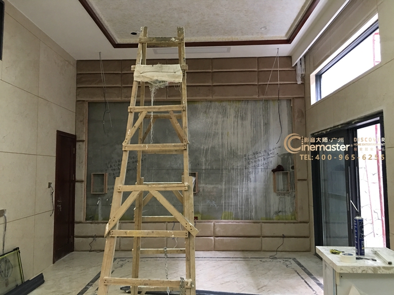 墻面已貼完大理石,投影幕墻面貼了軟包,音箱隱藏在投影幕后面,已做好木框造型