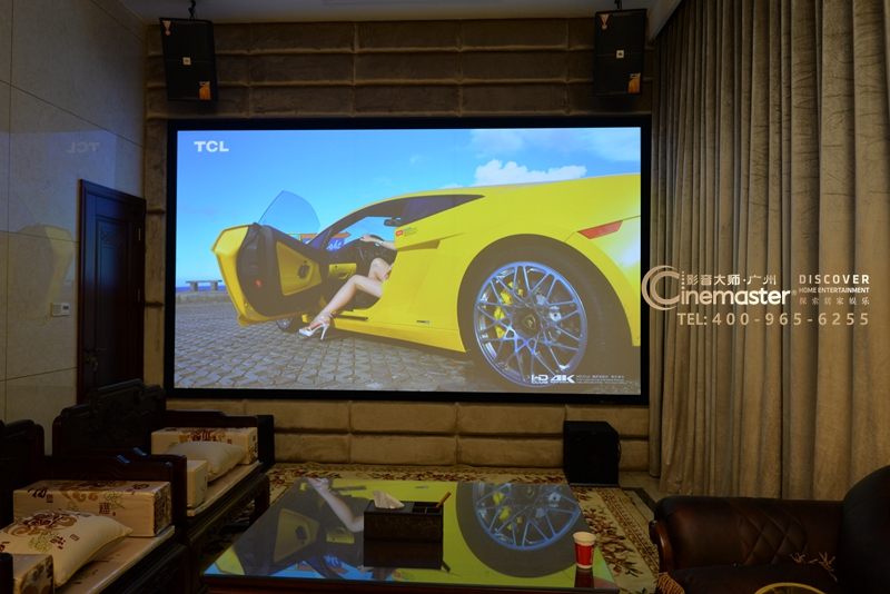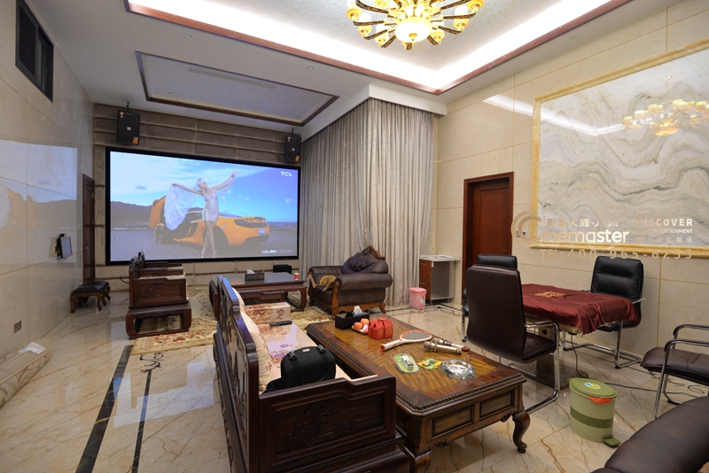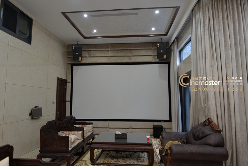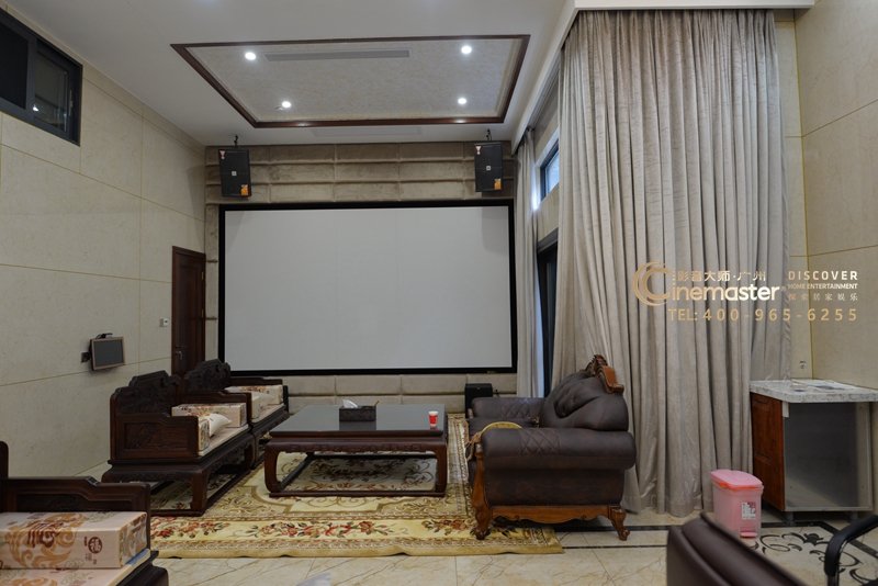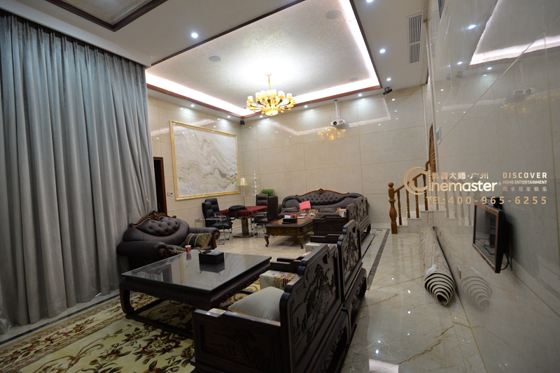 用戶房間為負一層娛樂室,前部分窄,后部分寬的不規則空間,右側有落地窗,左側與扶手樓梯相連,屬于比較空曠的房間。此房間用戶原本打算作為休閑娛樂室使用,因此沒有考慮做密閉的空間,這對影音房的聲學處理將會增大難度,并且在我們為用戶設計影音房的時候,用戶已經制定了墻面大理石。我們知道,在影音房做家庭影院,一定是需要足夠的吸音量,所以在還能施工的地方增加了一些聲學材料。前墻面貼了軟包,右側窗簾也選用了兩層絨布厚窗簾,影音房前部分地面還鋪了地毯,再加上我們工程師后期對聲音的專業調校,最終得到的效果也還算比較滿意。此影音房還使用了當下最新的智能技術,一鍵打開電影模式,自動智能燈光,智能遙控......下面分享安裝實拍圖。