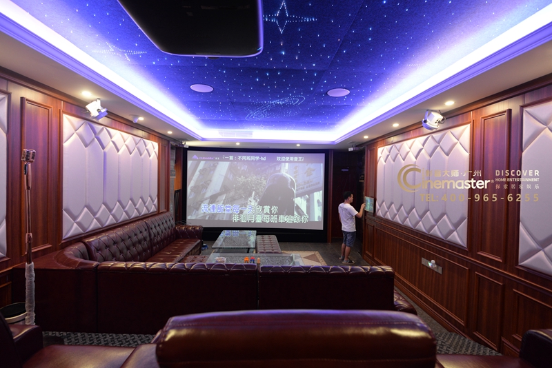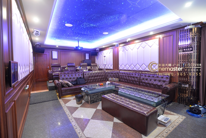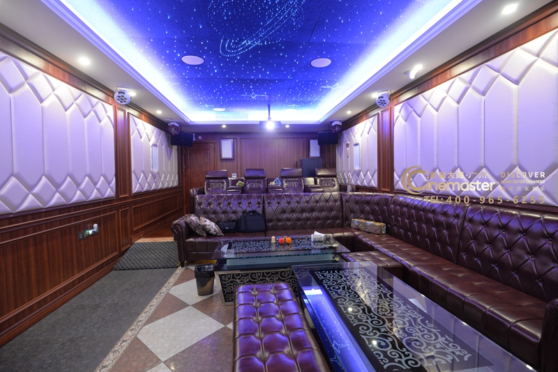 用戶影音房比較長,但寬度有限,高度3.2米。沙發設計了兩排,前排采用L型沙發,第二排做了抬高設計,太空艙影院沙發放置在第二排。用戶對影院卡拉OK要求都比較高,影院系統采用了7.2.4杜比全景聲配置,卡拉OK采用4.1配置。頂部做了星空頂設計,聲學部分采用了傳統的聲學設計,內嵌吸音棉,墻面貼軟包處理。整個房間的色調采用的是比較偏中式的風格,音箱采用內嵌式,下面分享實拍圖片。