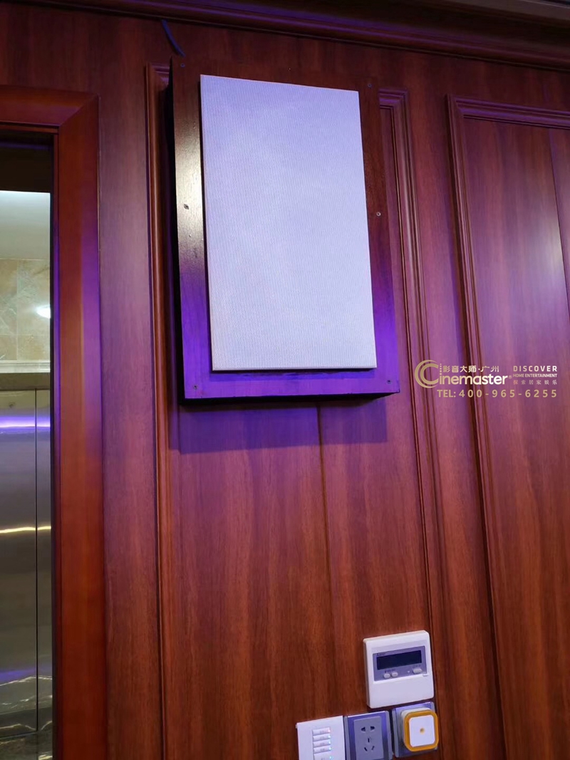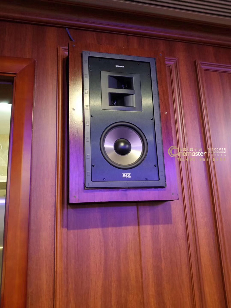 可以看到墻上的環繞音箱,杰士THX-8000-S 未蓋上白色外置時狀態 ,此環繞高音單元采用了杰士特有的偶極高音單元,即雙方向高音,可以使聲場的范圍更寬廣,音箱厚度僅100mm,在墻上設計一個音箱盒,音箱內嵌到盒子里,非常省空間。