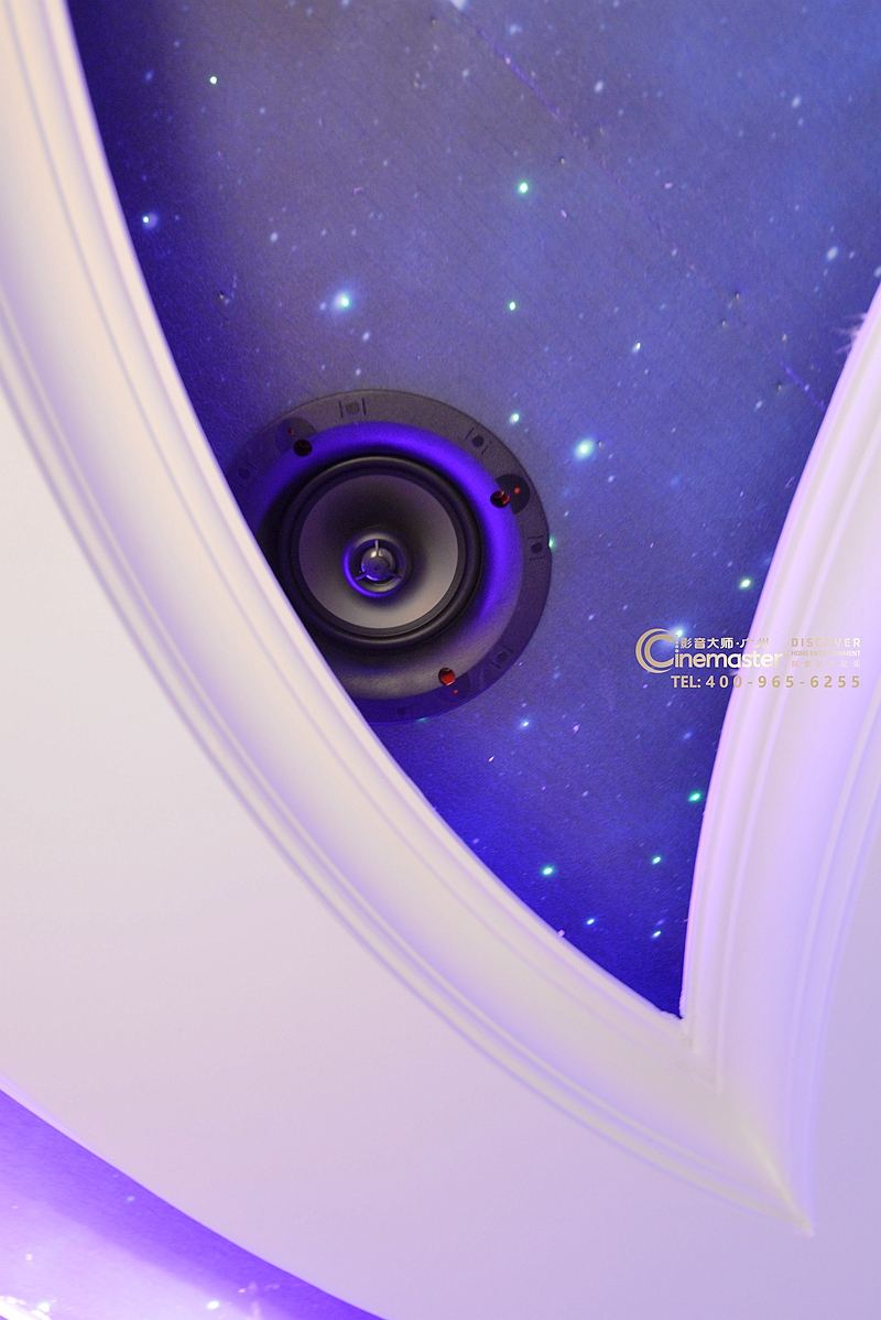 影音房后方全景;后環繞由于后墻無法嵌入,則選擇了吸頂安裝,吸頂音箱使用杰士DS-160CDT,杰士獨有的CDT可控方向性吸頂喇叭,可根據最佳觀影位置調節喇叭角度及方向;且