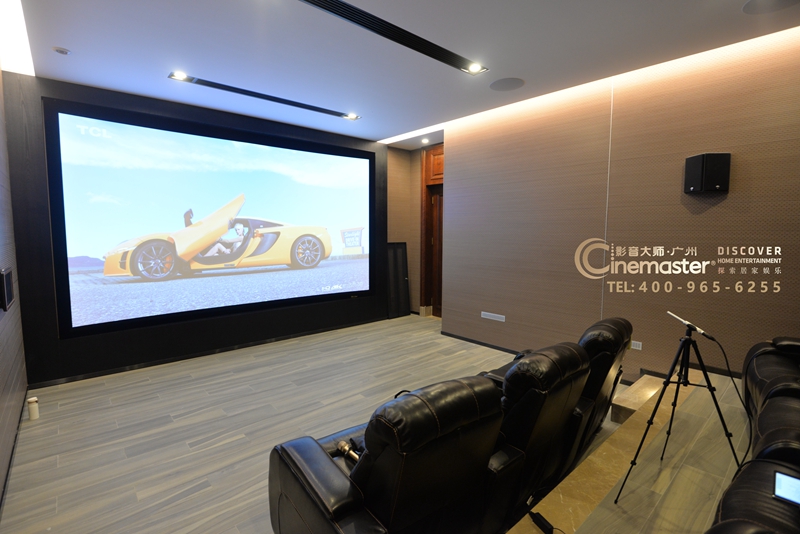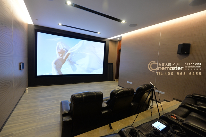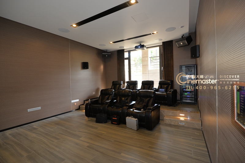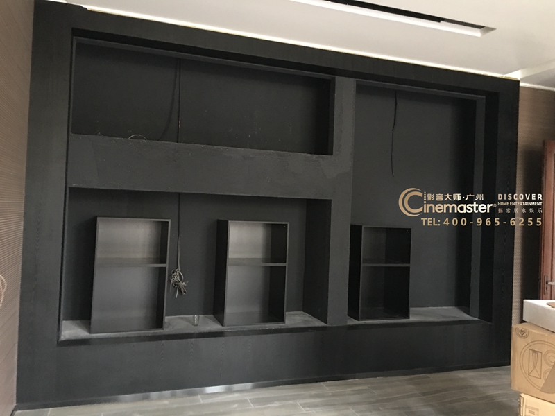 影音房前墻面為不規則空間,由于存在承重墻的原因,只能錯開承重墻放置音箱;前墻面均噴黑處理,這樣在使用透聲屏幕時可以避免畫面反光