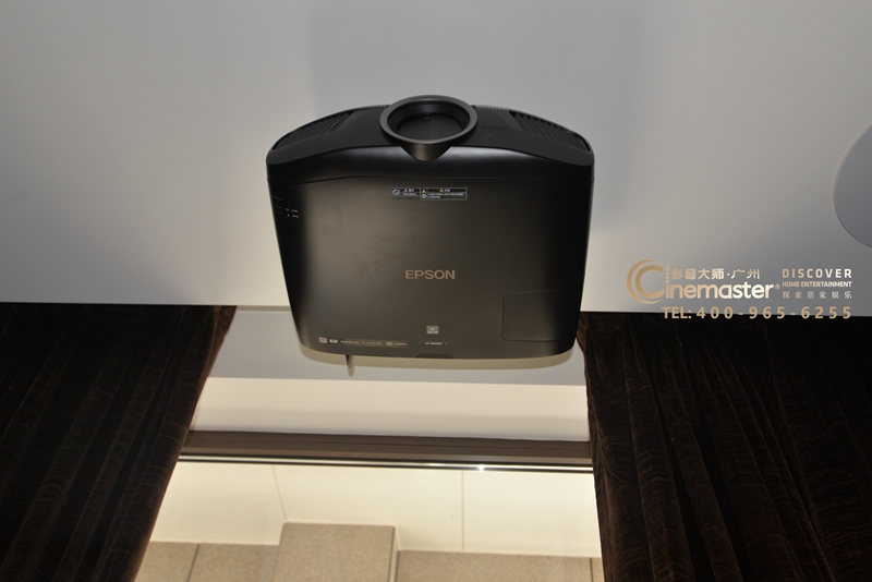 愛普生TW9400 4K投影機吸頂安裝,機器重量約11公斤,安裝位置需要加固處理。TW9400是2.1倍大變焦的機器,投影220寸可以最遠放置在14米位置,所以此次影音房安裝的時候投影機吊掛在影音房后墻處,此外,投影機還具有強大的電動位移功能,鏡頭記憶功能。