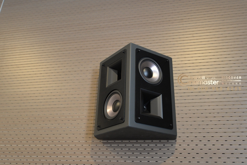 側墻環繞音箱采用杰士的KS-525-THX壁掛式音箱,圖為未蓋上外置時狀態,此款音箱同樣為偶極雙號角高音雙低音設計,可以覆蓋更廣的聽音區域,方便后期安裝及調試