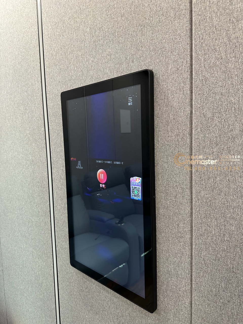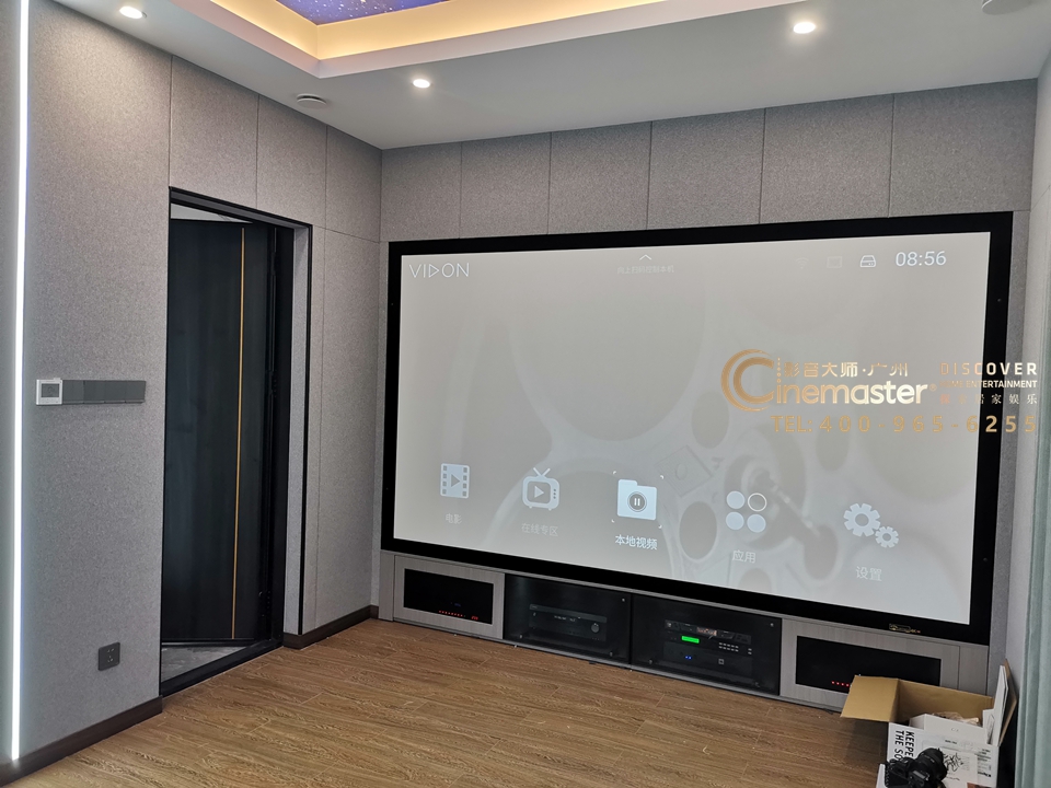 130寸平面畫框幕,影院音箱及卡拉OK音箱均隱藏到屏幕后方;設備主機設計暗藏柜放置在屏幕下方