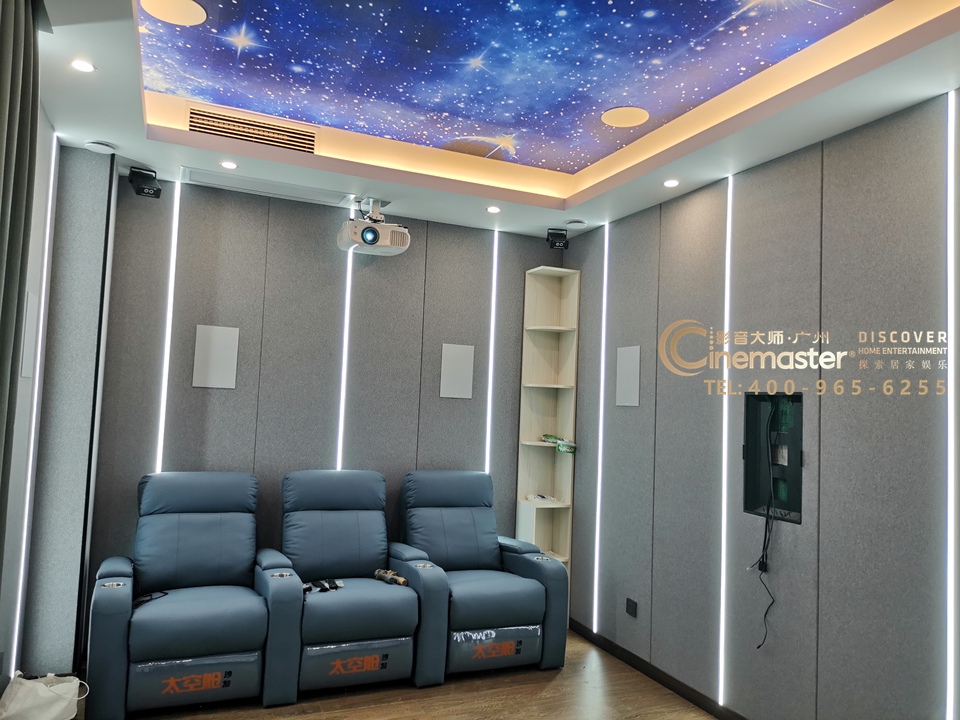 為了確保最佳的影音效果,我們從一開始就對這個房間的隔音和減震問題給予了高度重視。由于別墅的其他樓層也會有人居住或活動,因此隔音和減震的需求顯得尤為迫切。為此,設計者選擇了聲博士這一專業品牌,確保所使用的隔音材料具備最佳的性能和品質。