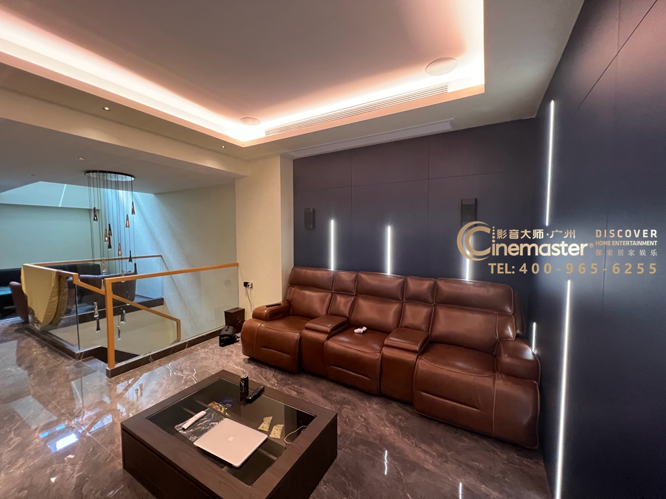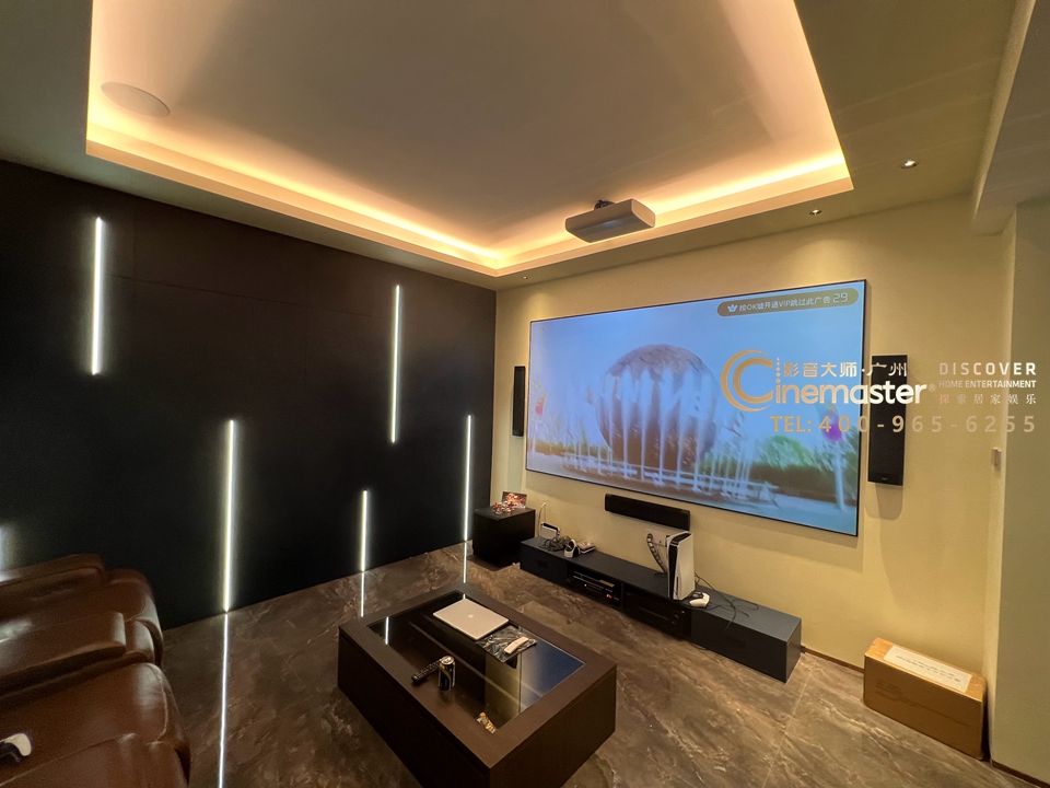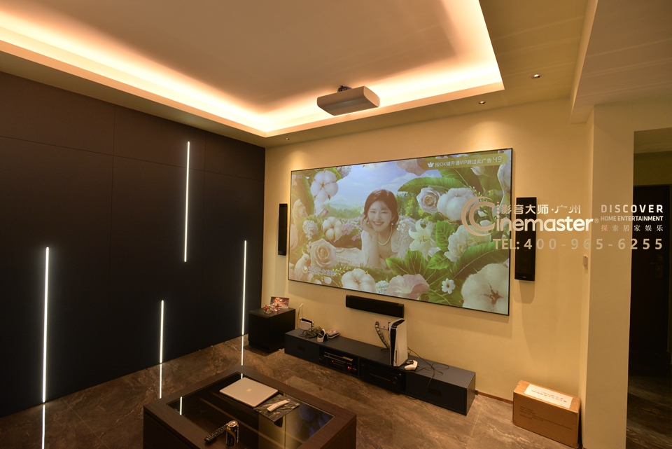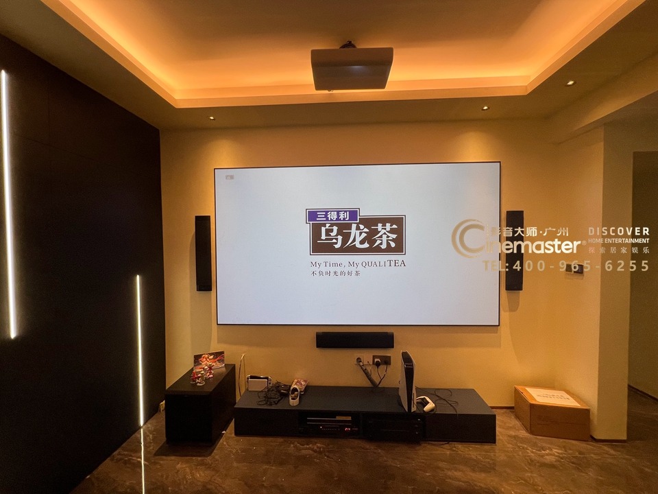 三星P7激光投影吊裝在天花;杰士SP-120低音炮放置在地面;威動V8播放器放置是柜內