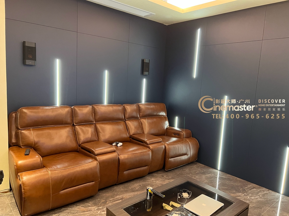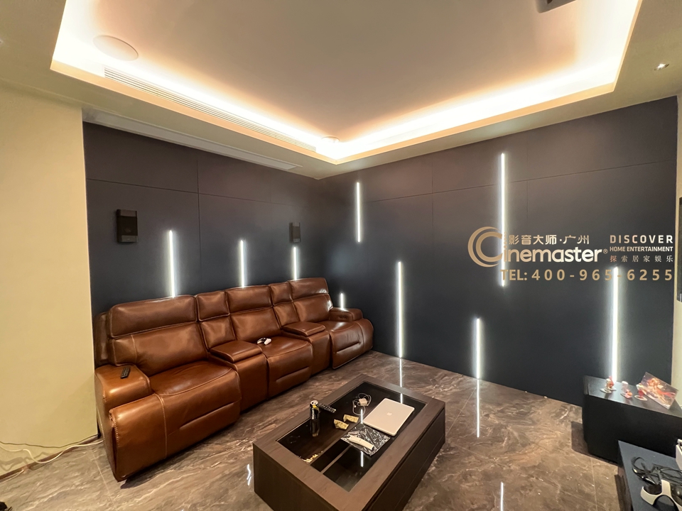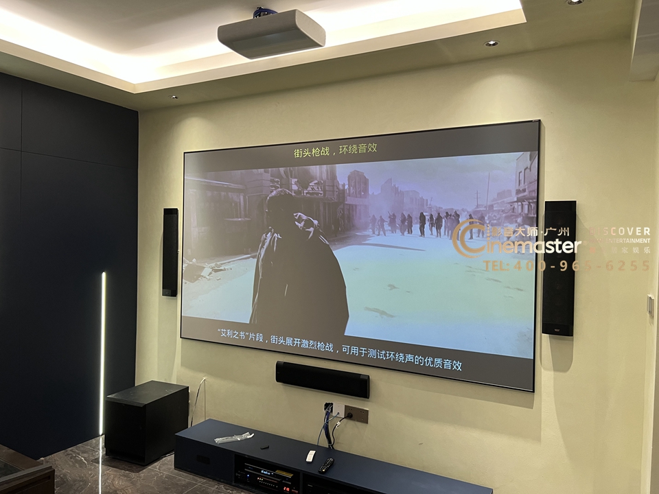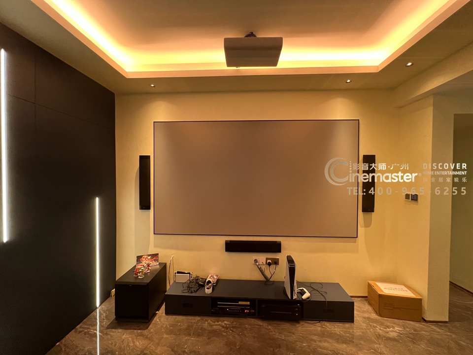 120寸菲涅爾抗光屏幕、杰士RP-640D超薄主音箱3只壁掛在墻面;